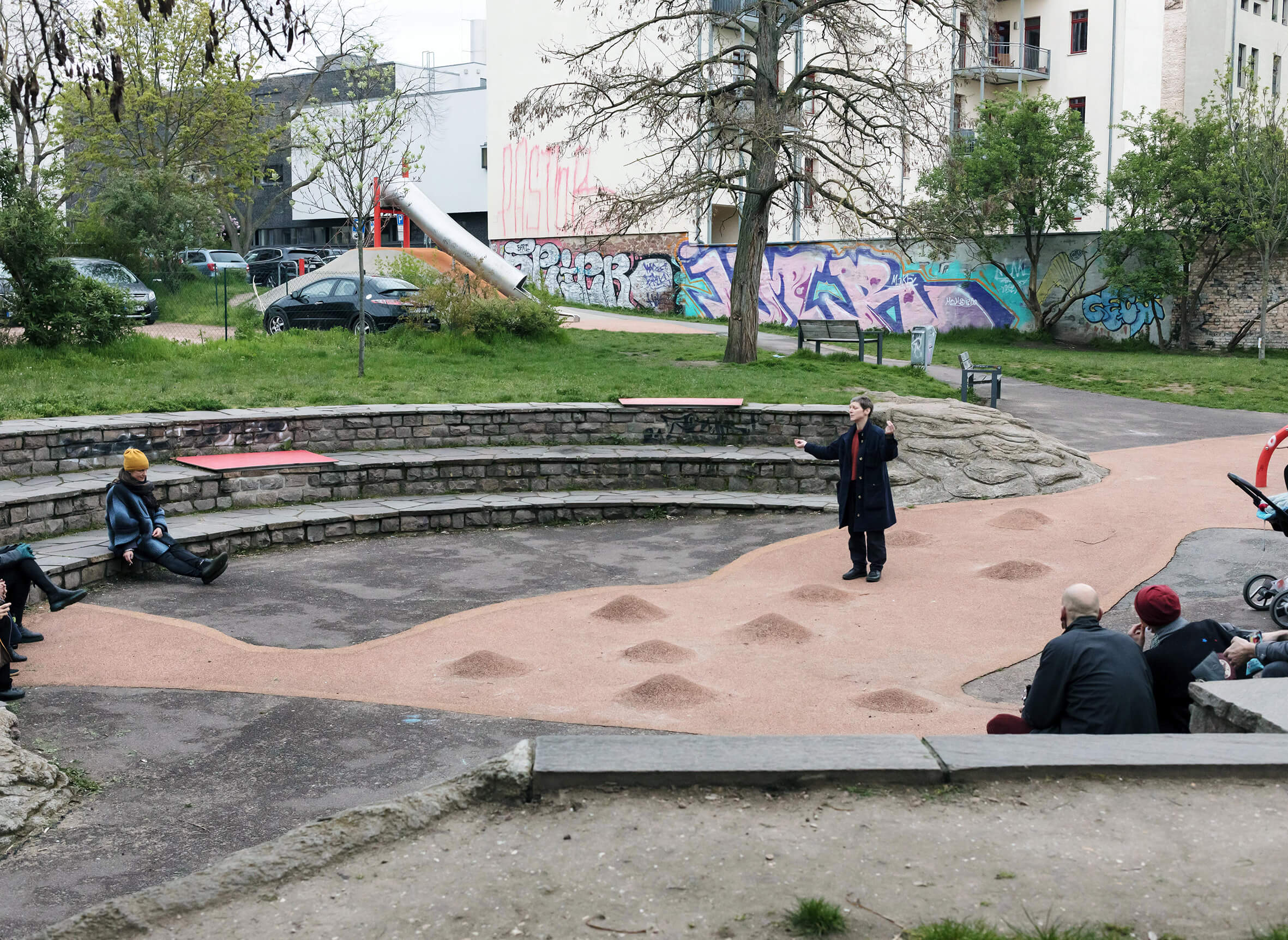 Anhand dieser Recherchen verwebe ich historische, autobiografische und fiktionale Geschichten so, dass der öffentliche Raum – in der Vorstellung der Betrachter*innen – verändert wird. Ein Umräumen findet statt. Wir überschreiben den Ort und seine Geschichte. Und: wir bewegen uns in ihr.