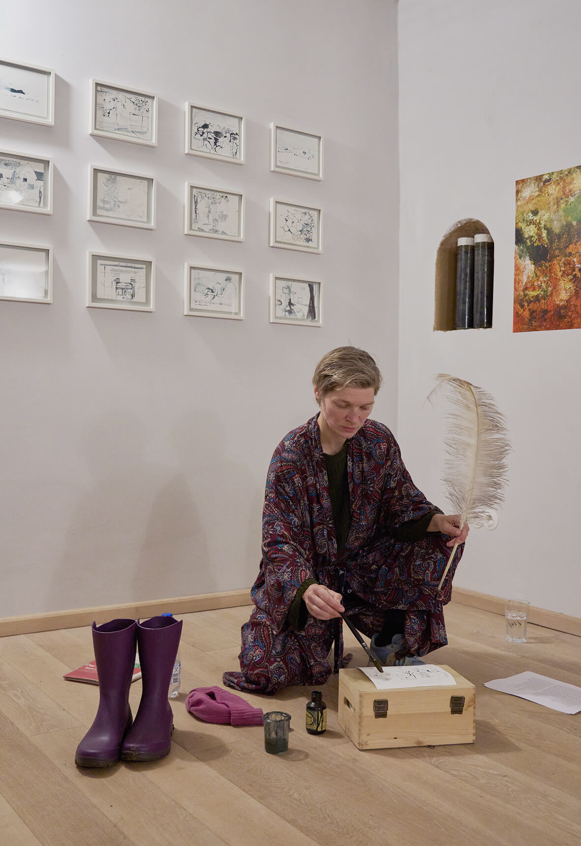 Die Zeichnungen entstanden während der Annäherung an den Ort Niederarnsdorf, dem Schauplatz meiner Erzählung. Ich habe das Gesehene mit der Linie angefasst - an ihm gerüttelt, wie an einem In-sich-versunkenen Menschen. Dabei kam Niederarnsdorf unddessen Umgebung in eine Bewegung. Alle Zeichnungen sind im Stehen und mit Federn vom Strauß und der Wildente gezeichnet. Herkunft: Haus Nr. 12 / Frau Winter und ihre Vögel.
