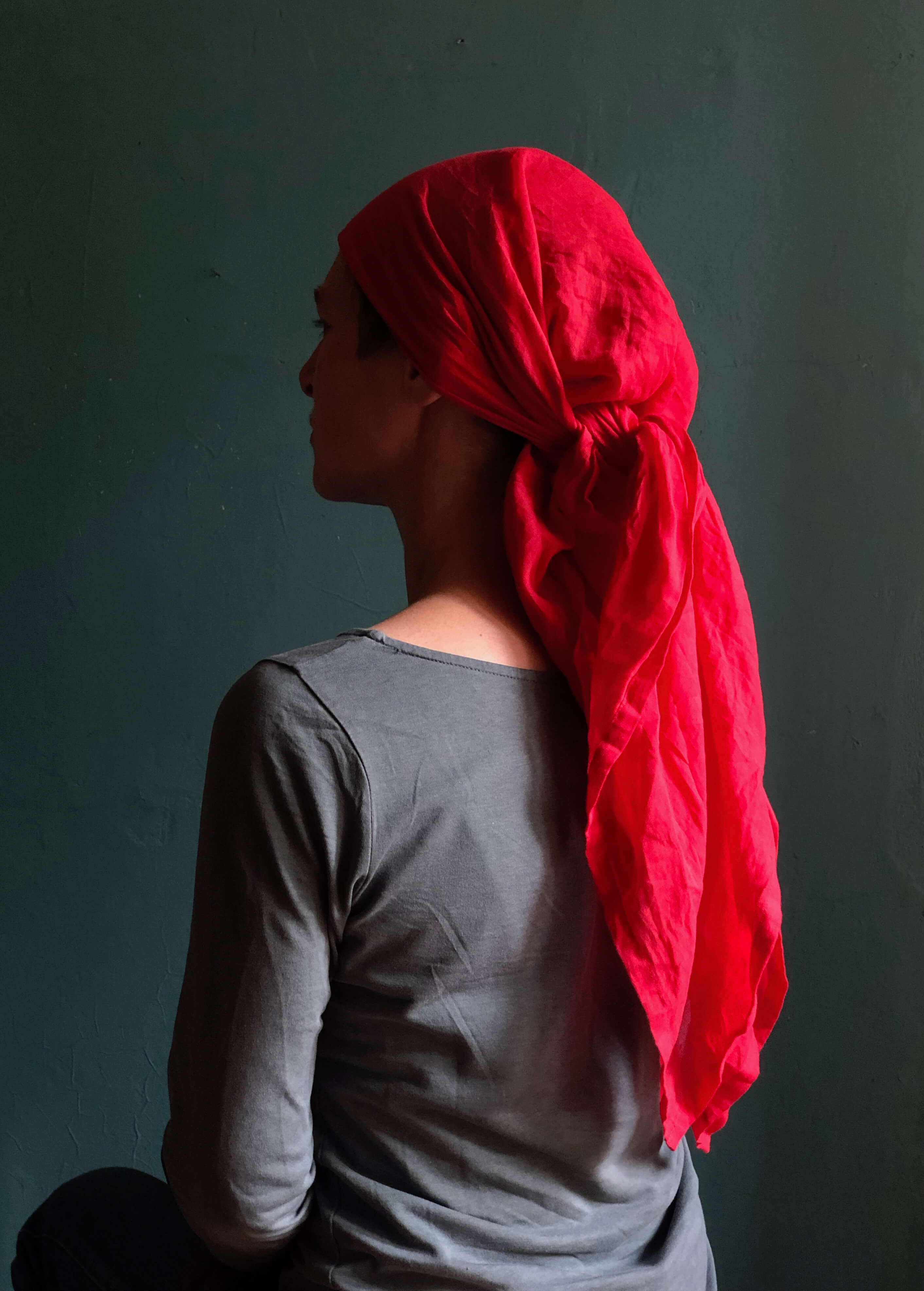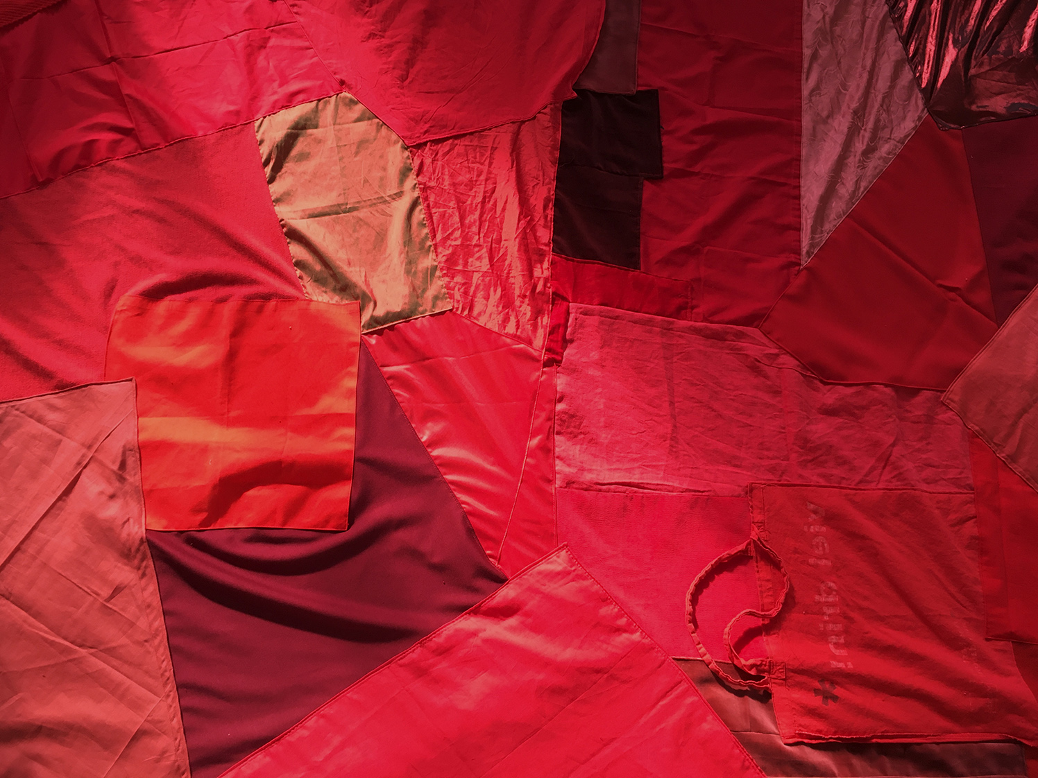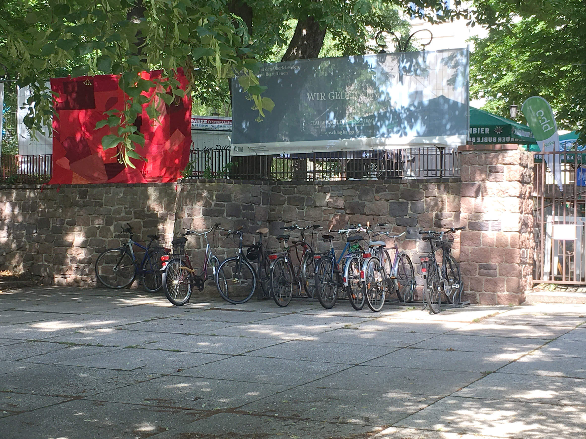 Das rote Tuch, das Arbeiterkampflied, nimmt Bezug auf die Geschichtsträchtigkeit des Volkspark-Gebäudes und seiner Idee vom „Heim" der Arbeiterklasse. Im Vorfeld rief Aichinger dazu auf, ihr einzelne rote Tücher zukommen zu lassen, die sie dann zu einem Ganzen verband. Das rote Tuch war einst Erkennungsmerkmal beim Einlass zu politischen Kundgebungen. „Gewachsen“ ist ein Banner, welches denen vor Ort zur Seite „steht“. Es hing für 3 Monate am Volkspark.