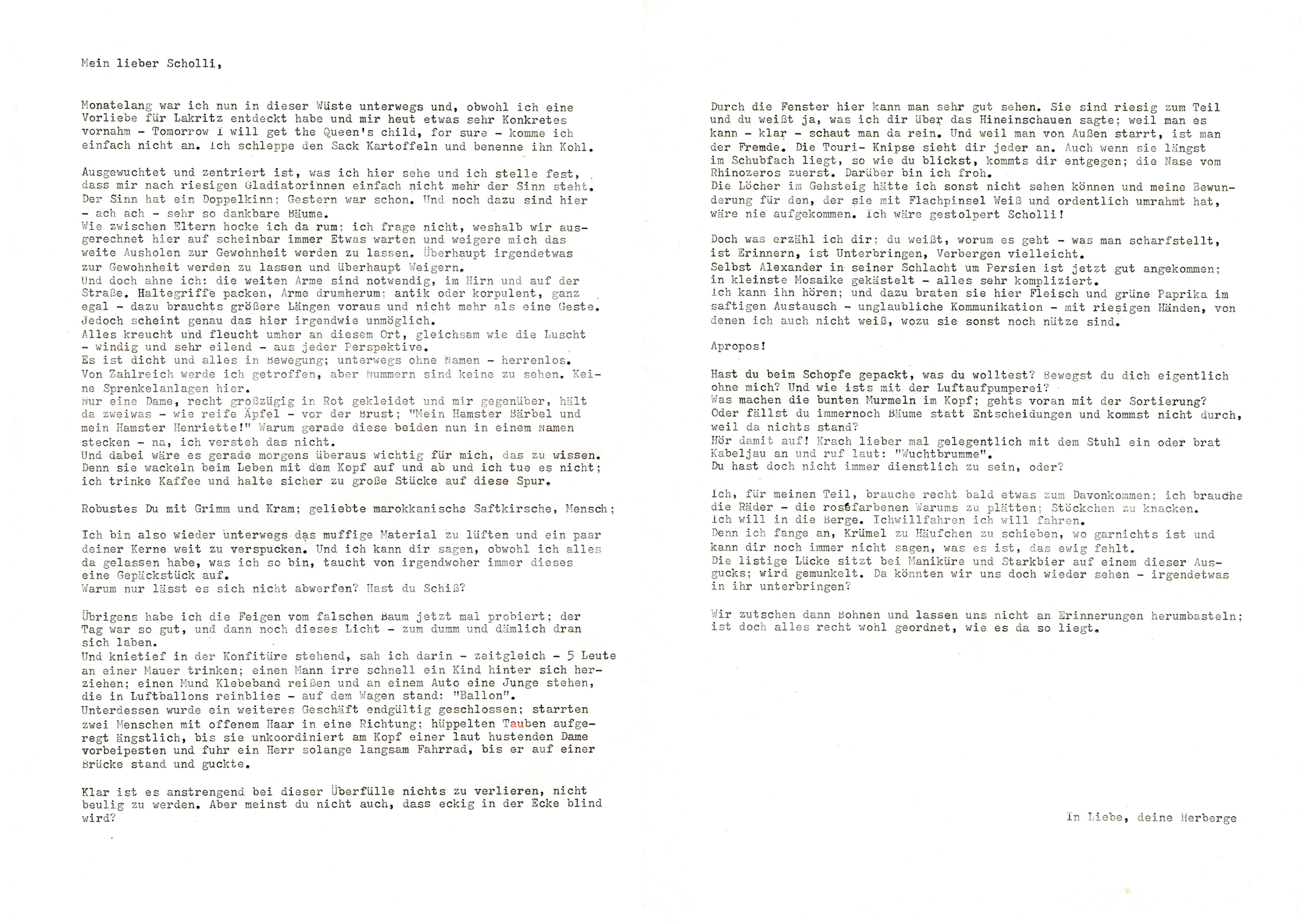 Oft sieht man mich in Vorbereitung dieser Erzählungen etwas zu lange, etwas zu nah an Hauswänden stehen; verbogen auf Geländer klopfen oder abrupt die Möglichkeit von Geschwindigkeit testen. Die Mehrfachnutzung eines Ortes tritt zu Tage, indem ich Zeit dort verbringe. Viele Stimmen wollen gleichzeitig zu Wort kommen – ich sammle sie ein. Nutze historische Quellen und Bildarchive, um unterschiedliche Zustände des Ortes zu erspüren. Führe Interviews, analysiere den „Alltag“ der Gebäude und ihrer Umgebungen und nehme Sound- und Materialproben, um Architektur und Auffälligkeiten besser zu verstehen.