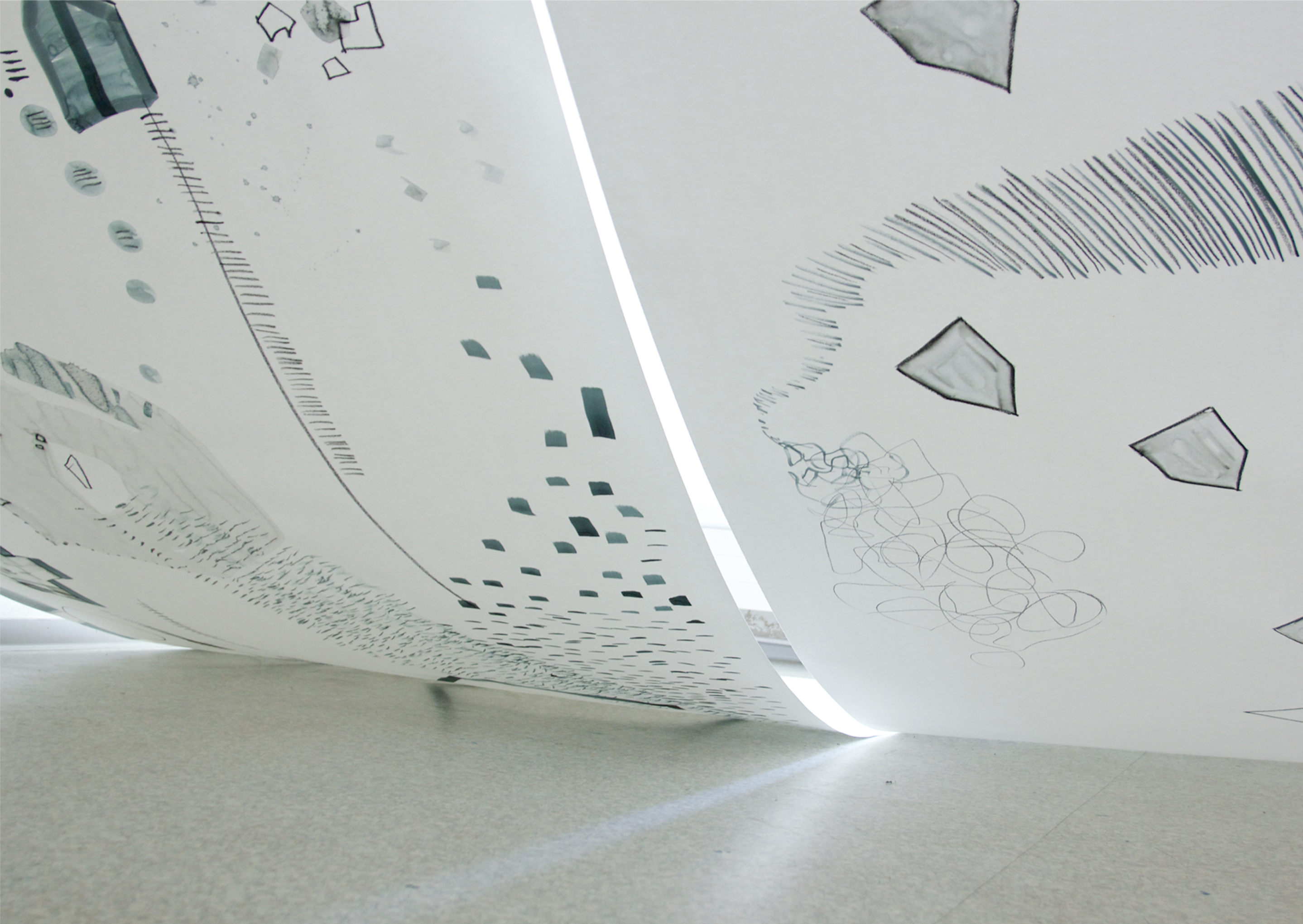 Audioloop, Kopfhörer, zwei Zeichnungen auf 10-Meter-Bahnen Aquarellkarton, Tusche und Wachs-Aquarellstifte