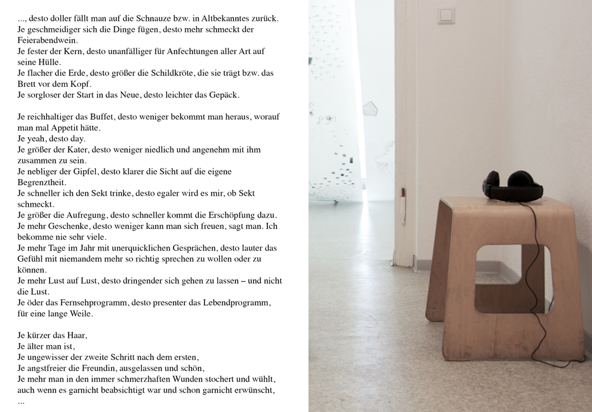 Juliane Schmidt und Henriette Aichinger komplettierten sich mehrere Monate "Je"-Sätze mit "desto"-Ergänzungen per Email. Diese Konversation wurde die Vorbereitung zur Installation Je, ____desto. In der Görlitzer Galerie Neun Görlitz zeichneten die beiden Künstlerinnen tagsüber vor Ort im Wechsel auf der Fläche, die es möglich war in den gegebenen Räumlichkeiten auszurollen. Sie antworteten dabei zeichnerisch auf die jeweilige Setzung der anderen. Je länger eine von beiden arbeitete, desto länger hielt die andere deren Kinder im Nebenraum bei Laune. Je besser die Laune, desto konzentrierter die Zeichnung. Nachts vertonten sie den schriftlichen Austausch der Je-desto-Sätze.