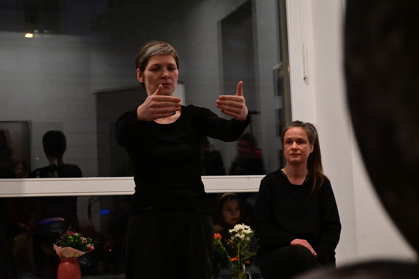 Die Künstlerinnen Juliane Schmidt und Henriette Aichinger stellten den, Jahre zuvor aufgezeichneten und 2024 aktualisierten Dialog zur Eröffnung der Ausstellung performativ vor.